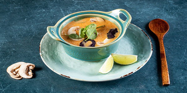 კრევეტი, ქოქოსის რძე, წითელი ქარის პასტა, ჯანჯაფილი, ძაძიკი